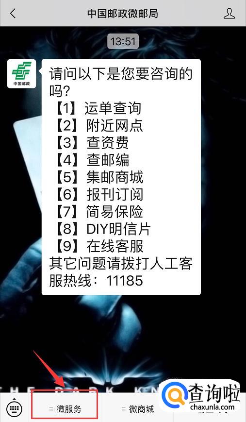 进入公众号,点击聊天界面左下角的【微服务】,如图所示;
