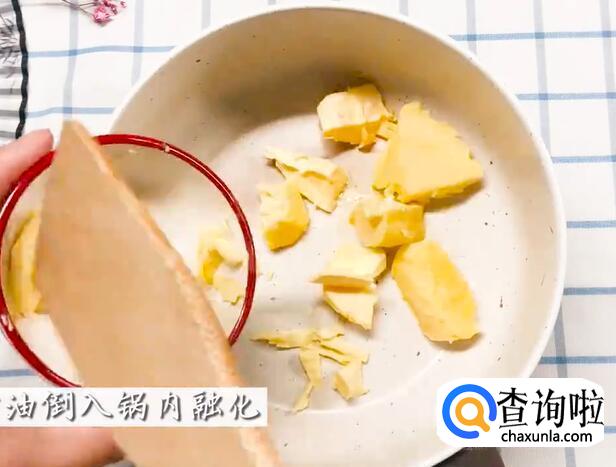黄油倒入锅中,加热融化。