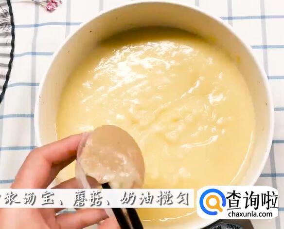 加入500毫升水,煮至浓稠。然后加入浓汤宝、蘑菇、奶油。
