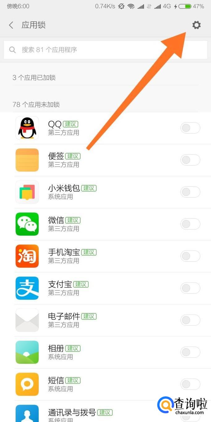接着点击应用锁界面右上角的设置图标。