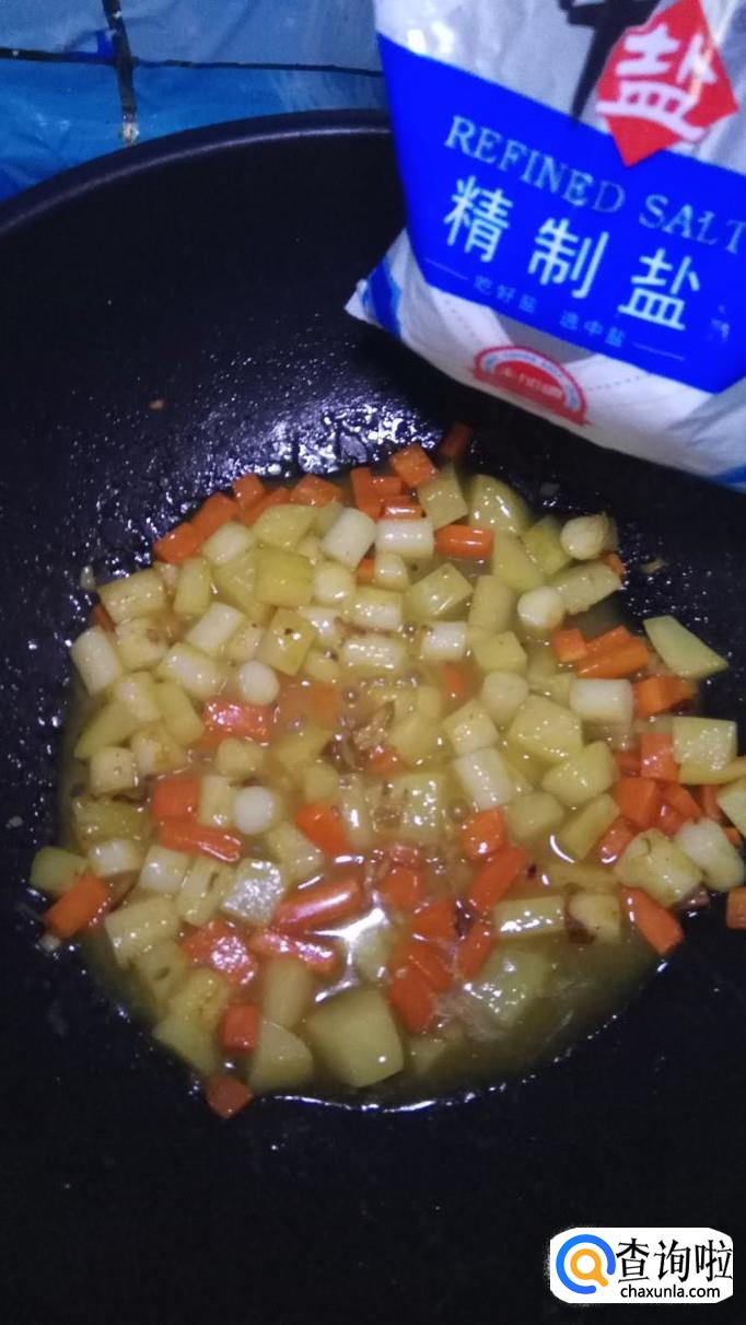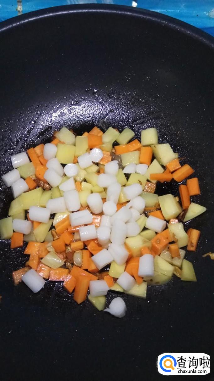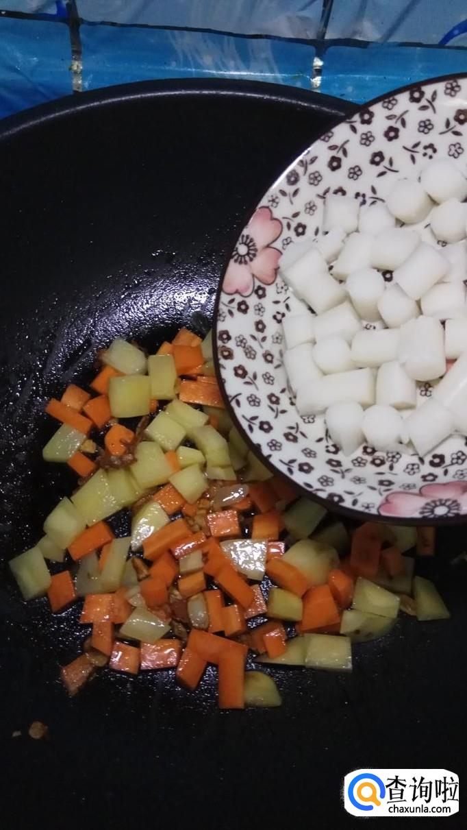 然后将年糕倒入锅中,与土豆胡萝卜一起翻炒,炒至食材变色,有些发软就好了。