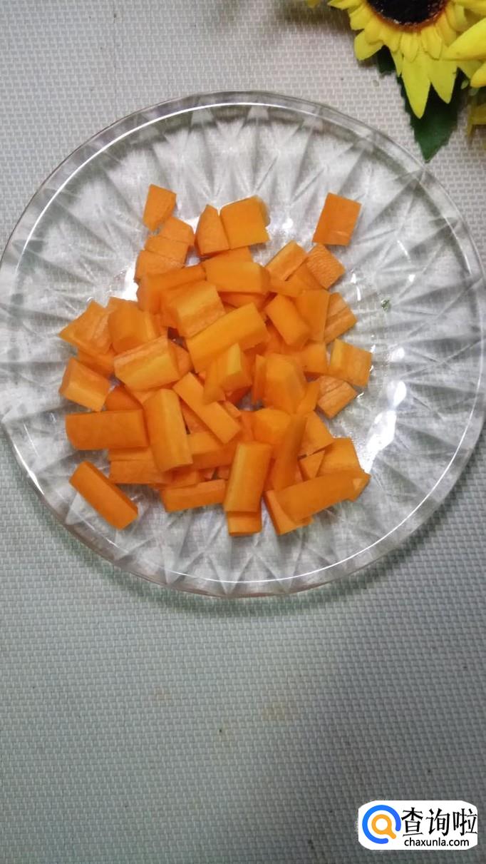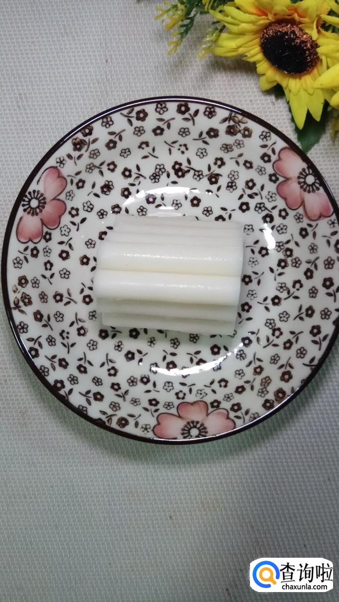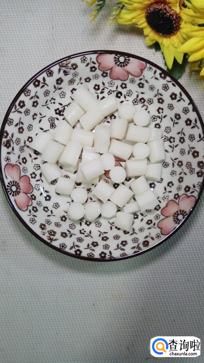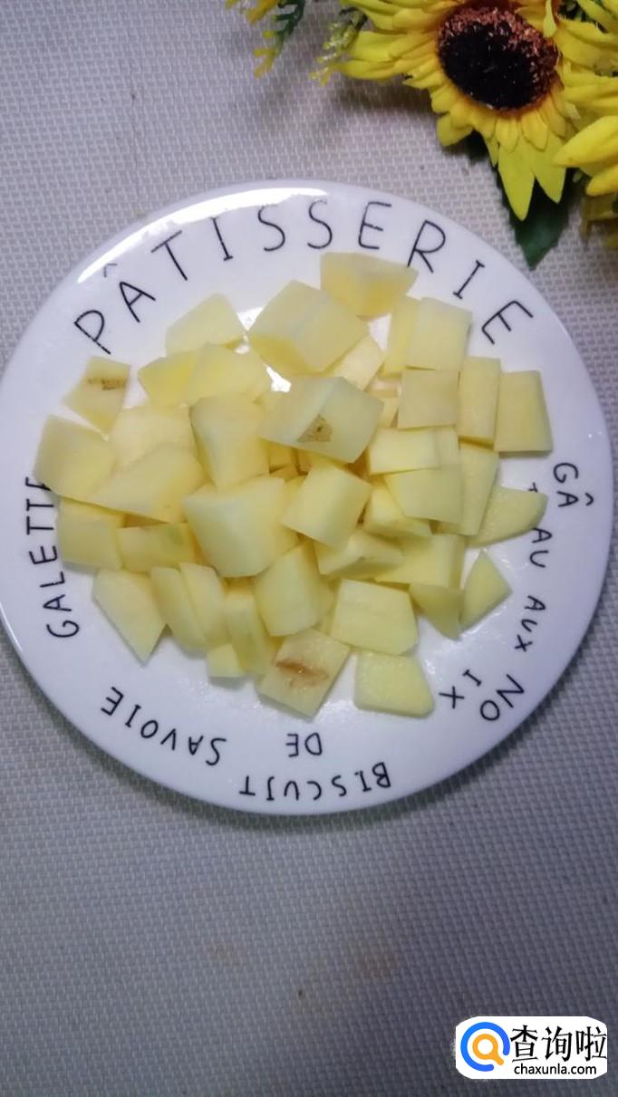 将胡萝卜洗净去皮后,切成小块儿;将土豆洗净去皮后,也切成小块儿,并且洗去淀粉;将年糕切成小段放入盘中备用。