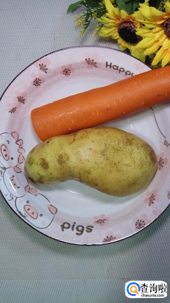 准备食材:准备一个土豆,一个胡萝卜,将他们分别洗净备用,将年糕从冰箱取出,稍微解冻一下。