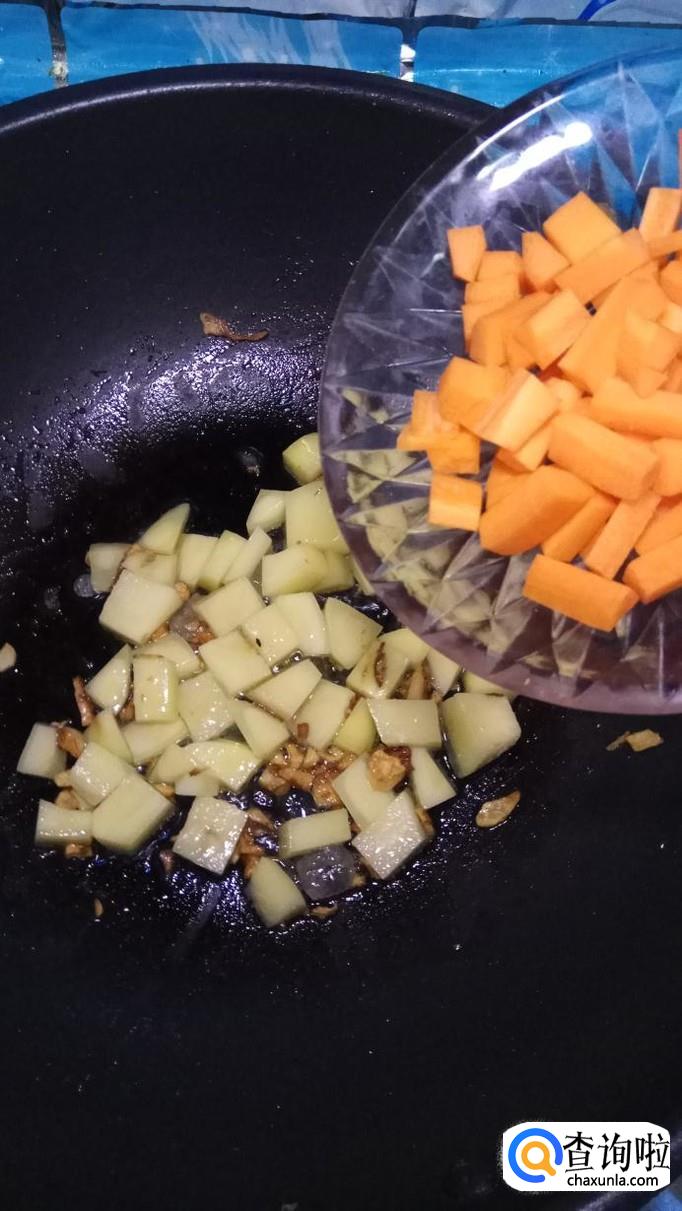 再将胡萝卜块儿倒入锅中,与土豆一起翻炒均匀。