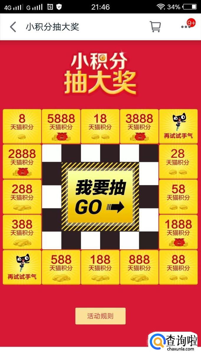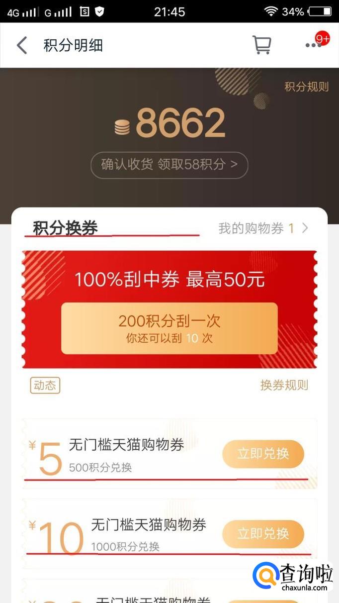 点击“天猫积分”图标,可以看到积分明细,购物后确认收货就能得到积分,积分可以用来兑换无门槛购物券,也可以用来抽奖。