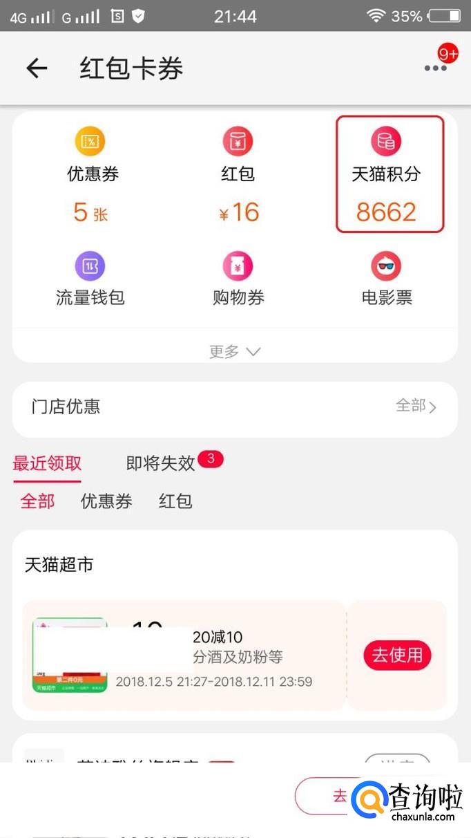用淘宝账号或者支付宝登录后,点击“红包卡券”,就能看到当前的积分了。