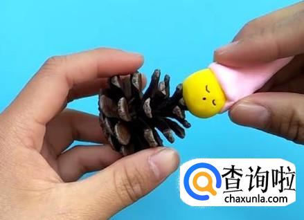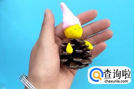 把画好五官的小人轻轻插到松果的顶端的位置即可。这些过程一定要在超轻黏土干燥前完成。