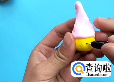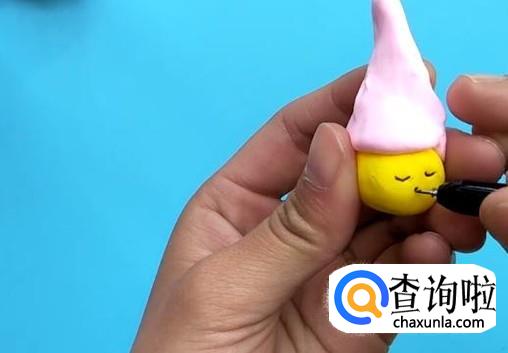 把捏好的小帽子放到小圆球的上面,组合成小人的样子。然后取一支笔准备绘画五官。