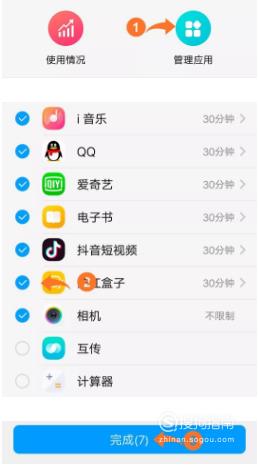 点击应用管理,选择要进行管理的app,点击完成即可