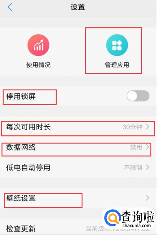 然后就可以设置“每次使用时长”、“应用管理”“壁纸使用”、“禁用网络”