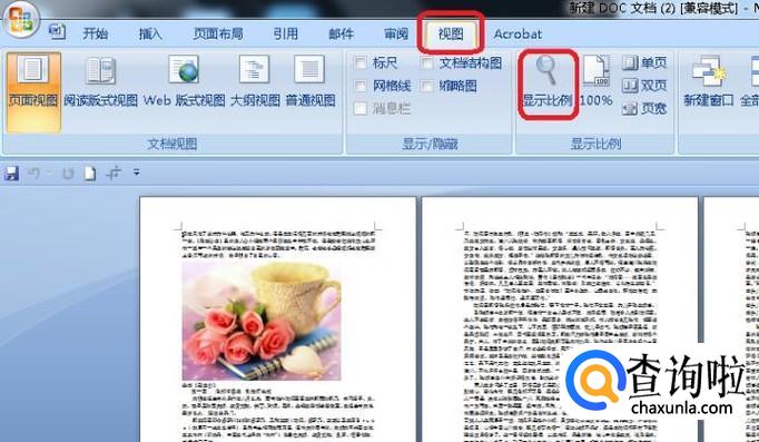 我们点击菜单栏“视图”标签,然后点击功能区的“显示比例”。