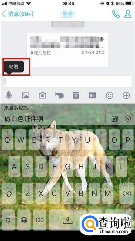 然后在QQ中的对话框中点击粘贴,如下图所示。