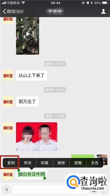 长按微信中的文字并点击复制,如下图所示。