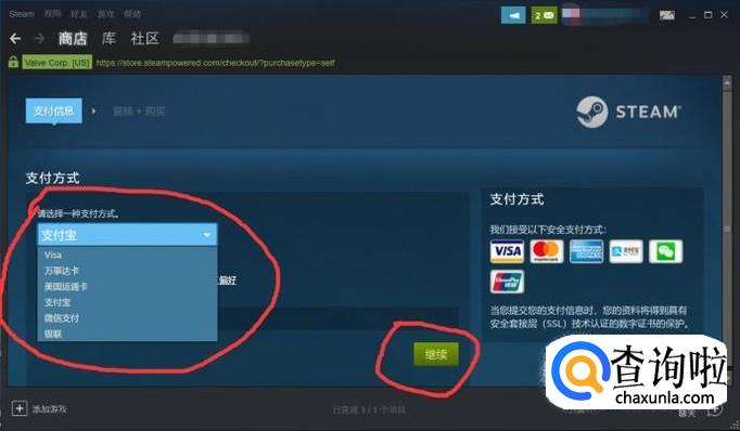 在跳转出的支付界面选择你的支付方式(这里以支付宝为例),选择好之后点击“继续”选项