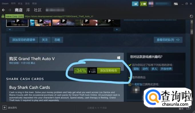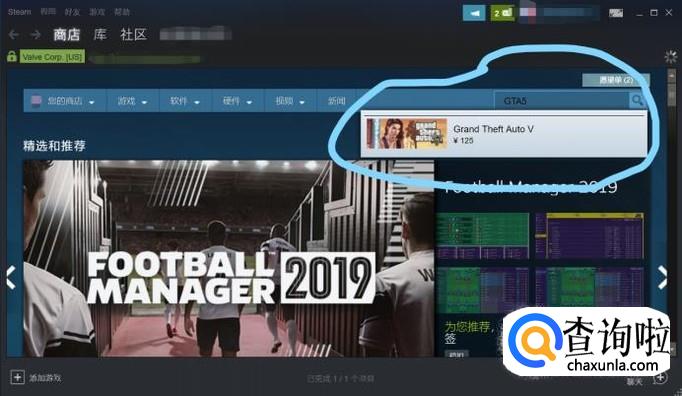 进入steam界面之后,再右上角的搜索栏中输入“GTA5”,点击搜索结果进入游戏界面