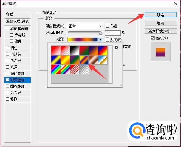 在弹出的渐变叠加对话框中,根据需要选择合适的渐变色,再点击确定