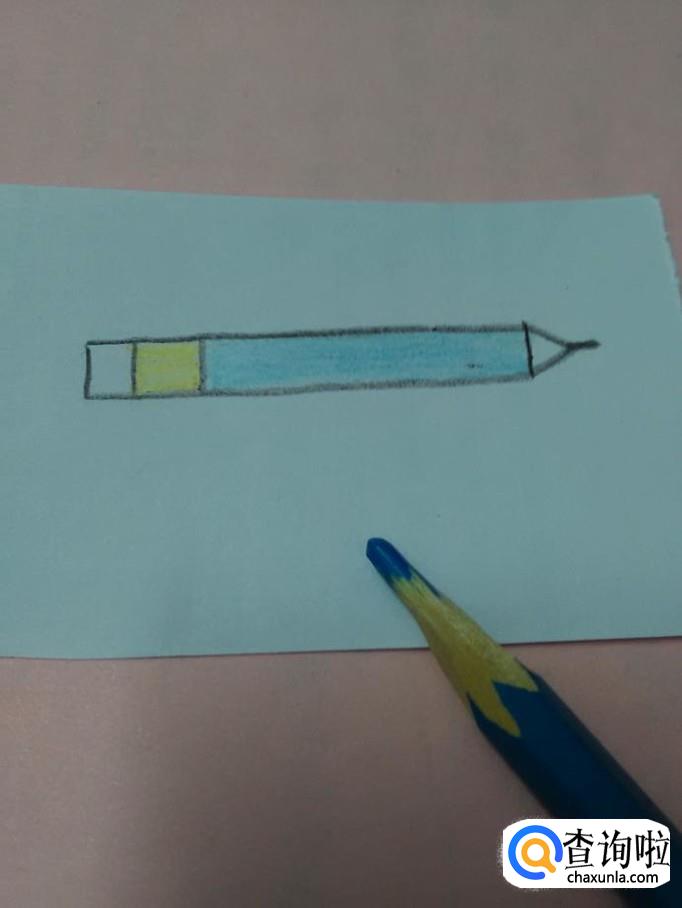 用浅蓝色把金属箍右边的笔杆涂上蓝色。