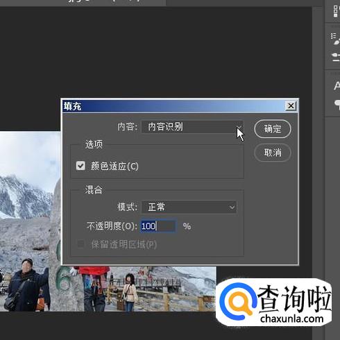 在弹出的填充对话框中,把内容这一项设置为:内容识别;再点确定。