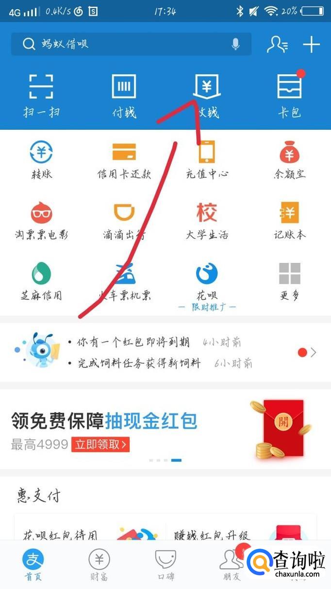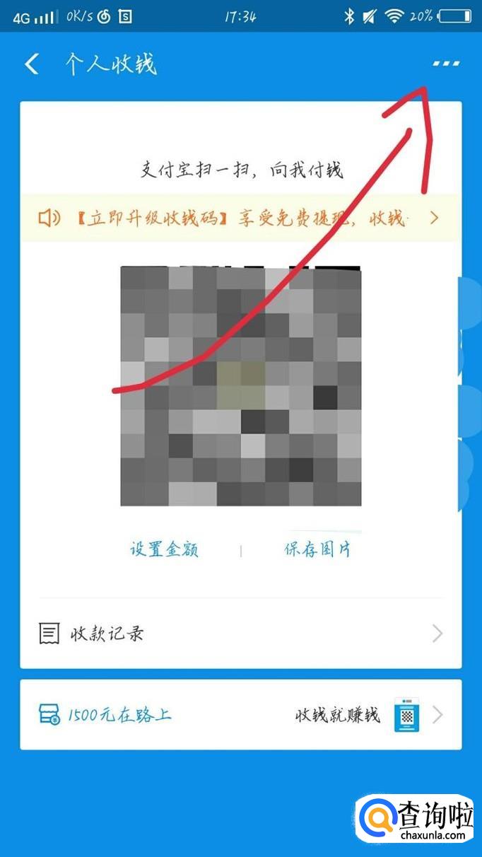 点击上面的“收钱”选项,如图1箭头所示。你会看到出现一个新的界面,点击右上角“3个点点”选项,如图2箭头所示。