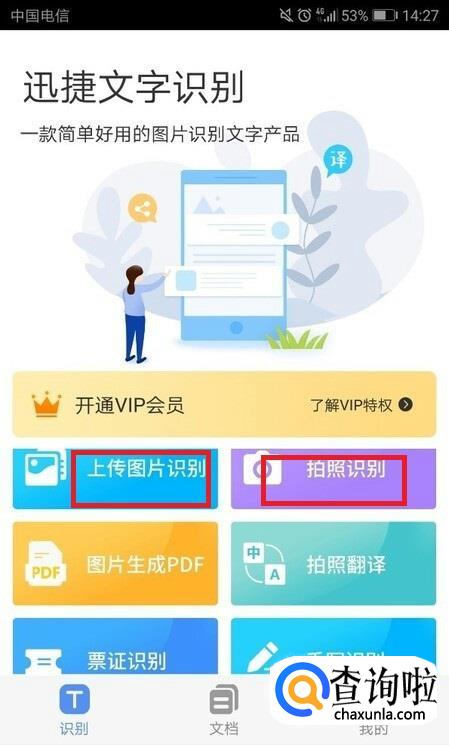 先把需要转换的图片保存在手机里,然后打开该软件,我们可以看到在文字识别的页面,有两个选择,【图片识别】和【拍照识别】,顾名思义,【拍照识别】就是拍照识别图片中的文字;而【图片识别】就是直接导入图片,将图片中的文字识别提取出来,我们点击图片识别。
