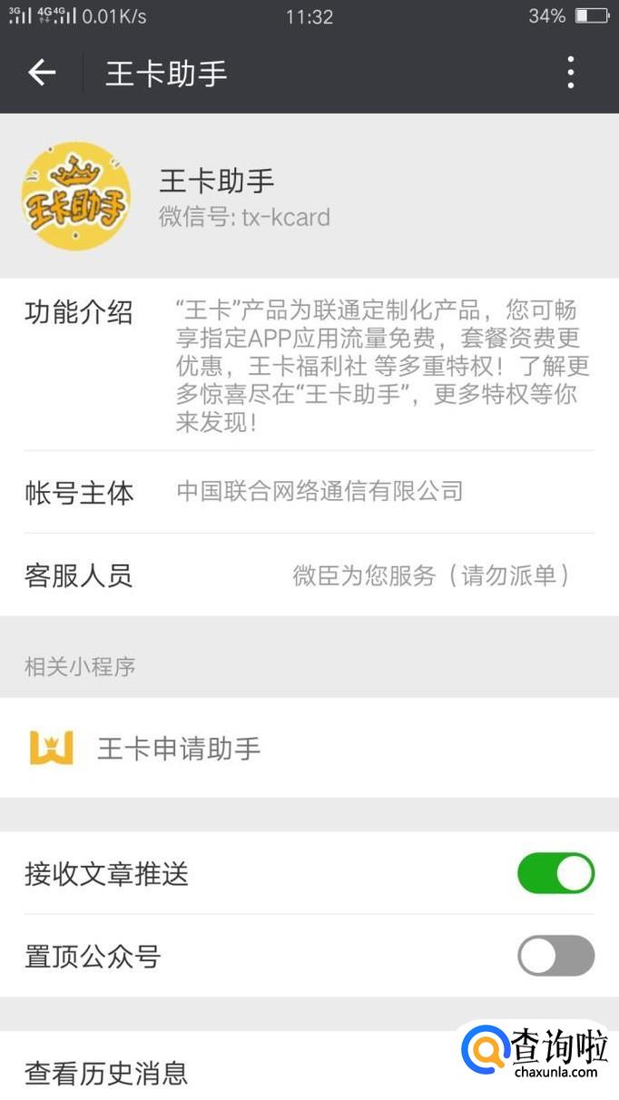 首先进入微信,搜索“王卡助手”公众号,然后关注“王卡助手”公众号就OK啦。