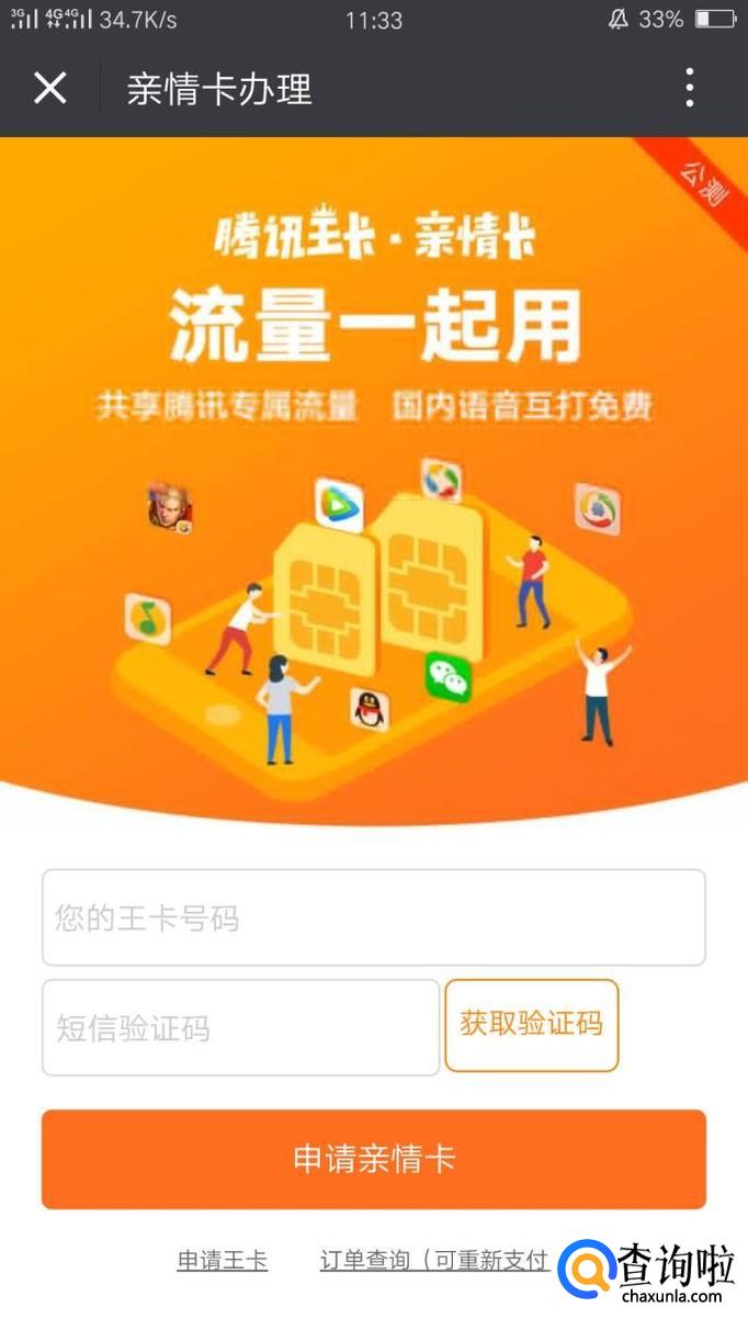 在个人中心中可以看到“申请亲情卡”,点击进入申请的操作吧!输入自己的王卡手机号码,然后获取验证码,就可以申请成功啦!