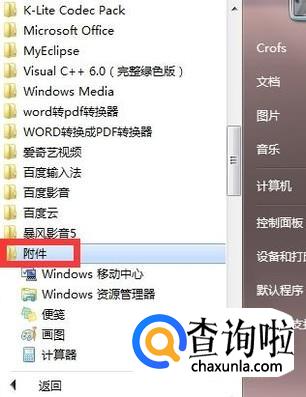 此处以WIN7系统为例。点击电脑桌面左下角的“开始”样式图标,打开全部程序,找到“附件”,单击打开附件文件夹。
