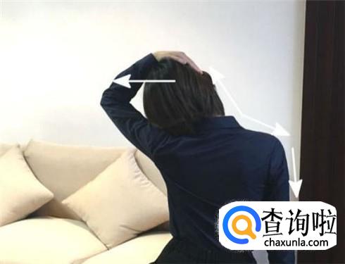 肩膀微微下沉,手扶头部分别往两侧拉伸,感觉脖子侧面至肩膀有拉伸感
