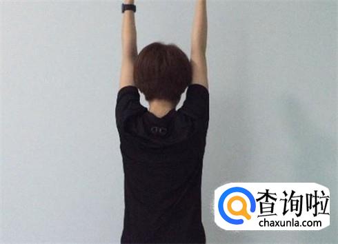 双手高高举起尽量夹住头部,可以感受到整个肩颈有酸痛感,保持一分钟放下