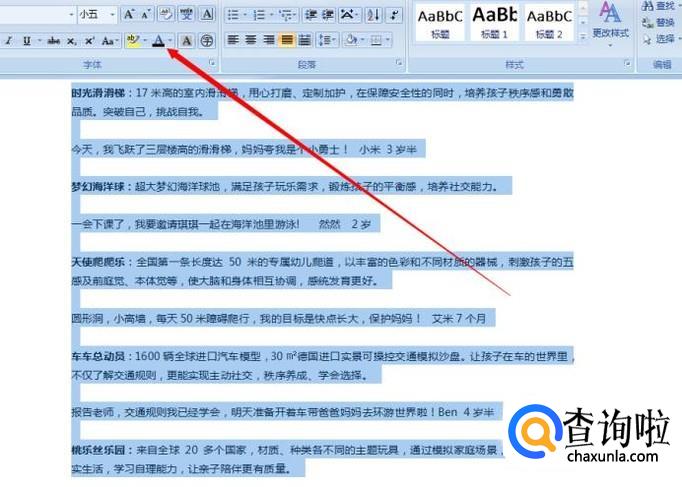 下一步就是调整字体颜色,最好是全部调整为黑色默认字体颜色,如果其中个别字需要改变颜色,那我们就选择另外一个颜色进行改变。但是,整篇WORD文档中,不要出现3种以上的字体颜色,除非是整段文字。
