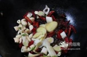 起锅烧油,油热后放入葱,姜,蒜,辣椒段煸炒。