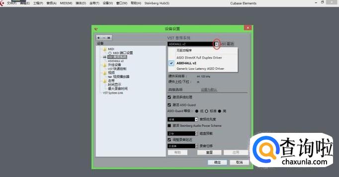 点开图中的小三角打开下拉菜单,选择你所使用的ASIO驱动,如果你使用的是外置声卡,在连接安装完成的情况下,Cubase会自动识别声卡驱动的信息,供你选择,如果你使用的是电脑本身自带的声卡,那么你需要下载一个ASIO4all的软件,这样Cubase才能识别你的声卡;
