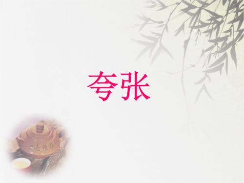 2、缩小夸张:故意把客观事物说得“小、少、低、弱、浅、……”的夸张形式。例如:一个浑身黑色的人,站在老栓面前,眼光正像两把刀,刺得老栓缩小了一半。现有成语寸土必争、滴水不漏、寸步难行等也有同样的表达效果。