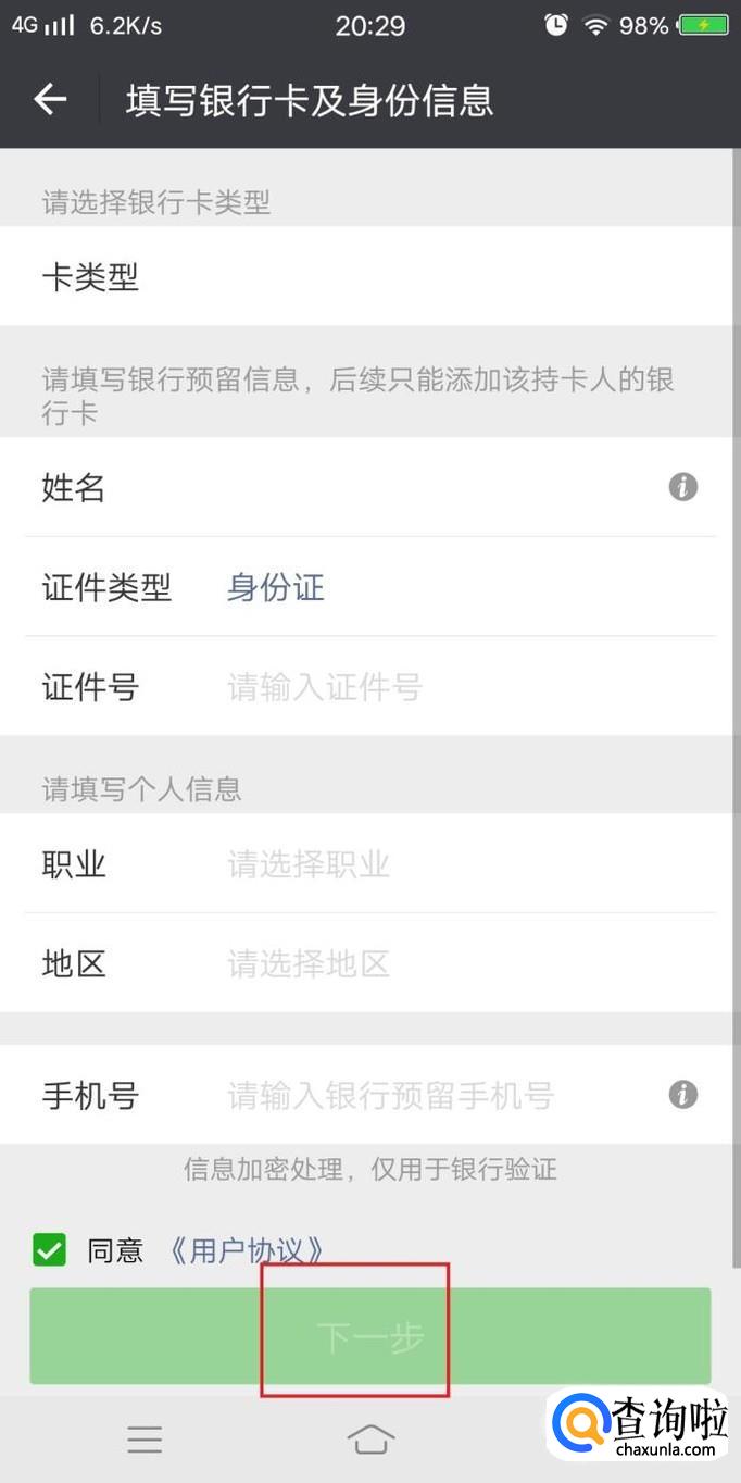 点击添加银行卡后,填写银行卡信息——填写银行卡及身份信息——验证手机号,如图所示