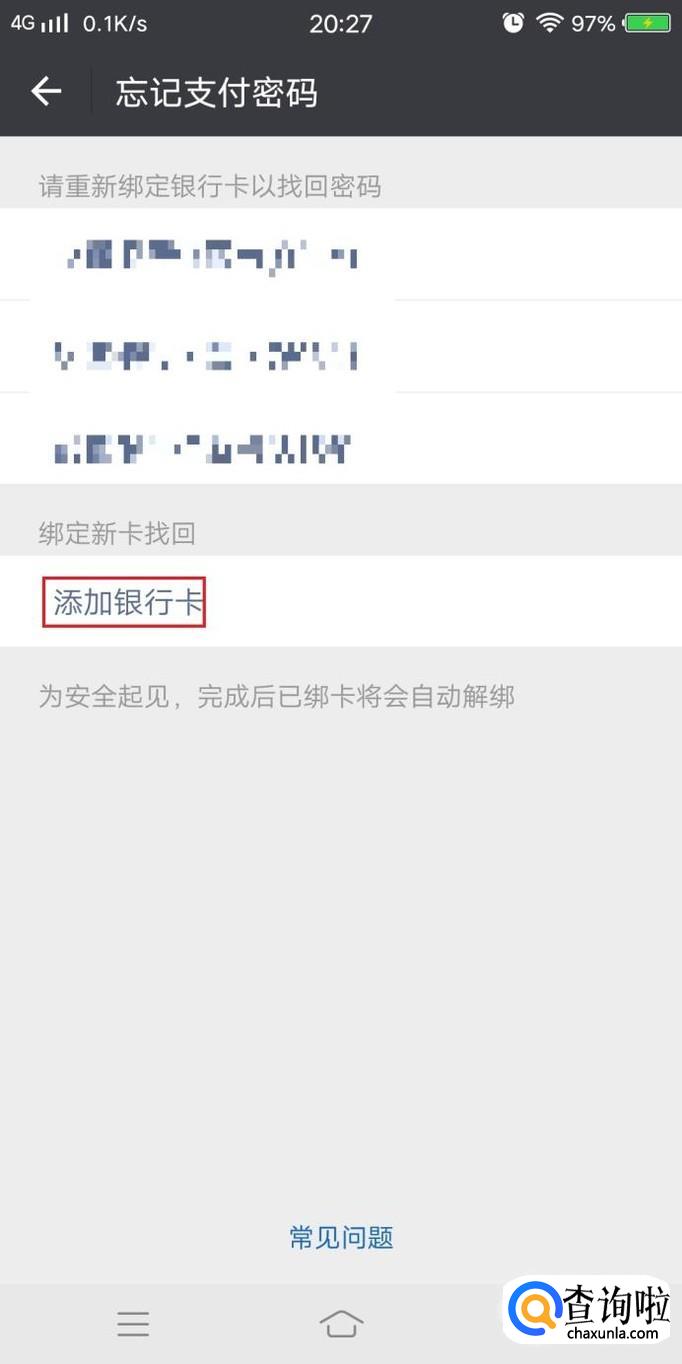 进入忘记支付密码后,点击进入添加银行卡,如图所示