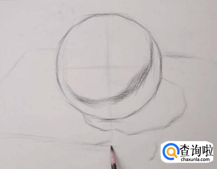 根据透视规律,画出球体的内结构线并找出明暗交界线和投影的大概位置,并强调出明暗交界线中距离视线最近的部分。
