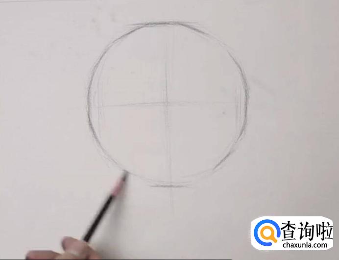 首先画一个正方形,画出对角线,找出一个交点为圆球体的圆心点,通过此圆心点作水平线和垂直线,找出圆球体外轮廓线与正方形相切的四个切点。