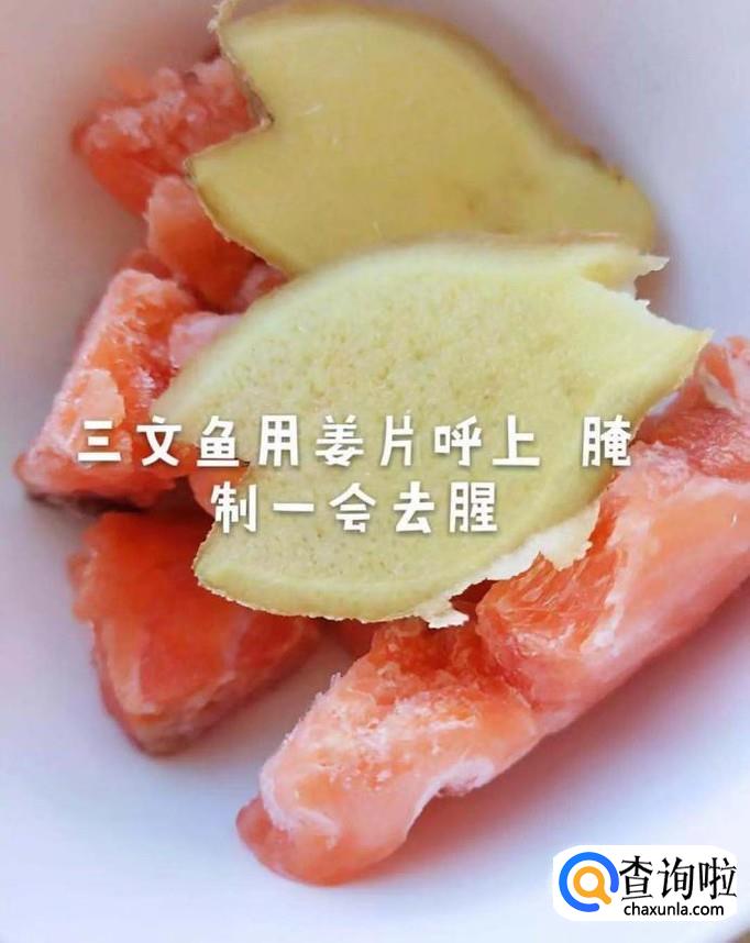首先将买回来的三文鱼用姜片腌制15分钟,如下图所示。小贴士:大家在腌制三文鱼的过程当中可以加入适量的料酒也是一个不错的选择。