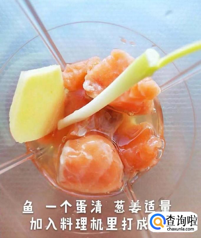 然后把三文鱼肉、蛋清和葱姜加入料理机中打成泥,如下图所示。
