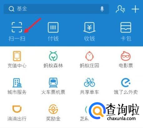 打开支付宝,点击首页面上面的“扫一扫”图标,点击进入。