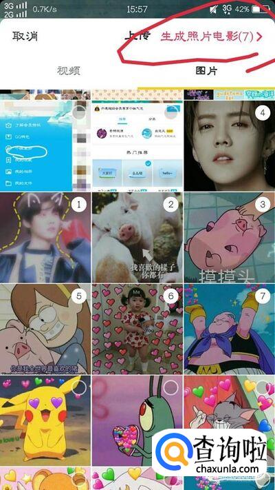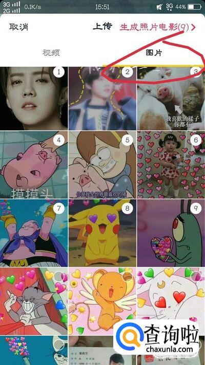 紧接着,大家点击屏幕左下方的“上传”点击以后,点击到图片的专栏,勾划出自己要做成视频的照片