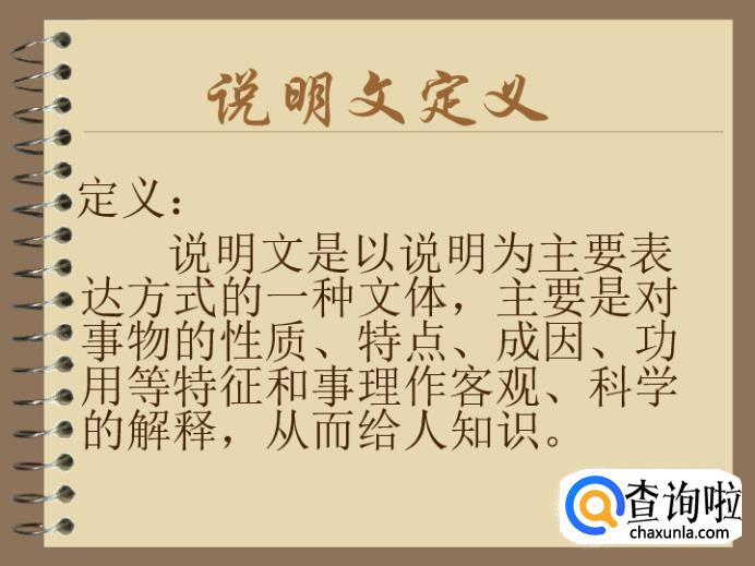 说明文是一种以说明为主要表达方式的文章体裁。它通过对实体事物科学地解说,对客观事物做出说明或对抽象事理的阐释,使人们对事物的形态、构造、性质、种类、成因、功能、关系或对事理的概念、特点、来源、演变、异同等能有科学的认识,从而获得有关的知识。说明文的中心鲜明突出,文章具有科学性,条理性,语言确切生动。它通过揭示概念来说明事物特征、本质及其规律性。