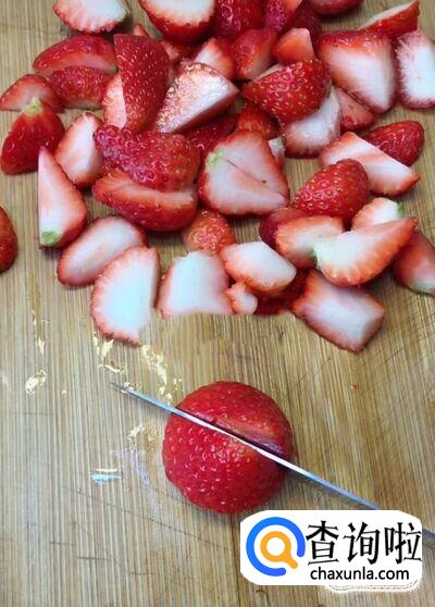 首先我们将草莓清洗干净,用刀切成小块备用