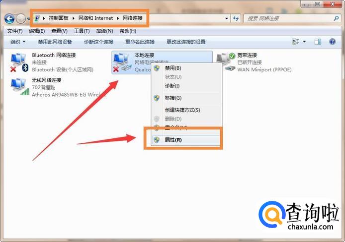 接下来就是设置DNS了,打开【控制面板】,找到【网络和Internet】【网络连接】,选择【本地连接】,点击右键进入【属性】。