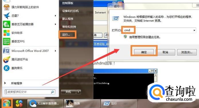 无法解析服务器的DNS地址应该是电脑设置有问题了。首先我们先来清空DNS缓存,打开【开始】,点击【运行】,在运行内输入【cmd】。