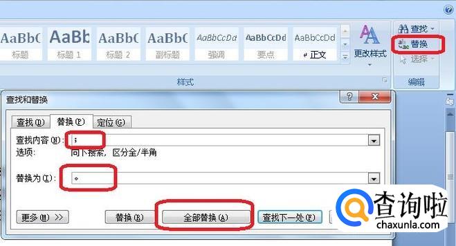 点击“开始”,如图所示,在工具栏右侧选择“替换”按钮,弹出“查找和替换”选项框,输入查找和替换的标点符号,然后点击“全部替换”。