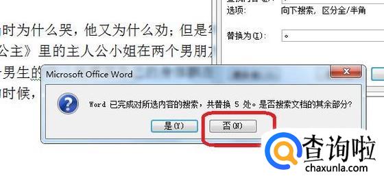 会弹出如图所示提示,“是否搜索文档其余部分”,我们点击“否”,这样, 标点符号就批量替换完成了,效果如下图所示。