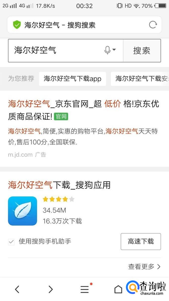 打开搜狗搜索,搜索“海尔好空气”将其下载并安装到手机上面,如图所示。