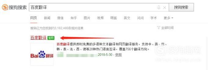 首先我们打开搜狗搜索引擎搜索“百度翻译”,然后点击第一个标题进入。