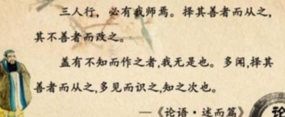 三人行,必有我师,出自于《论语·述而》。原文:子曰:"三人行,必有我师焉;择其善者而从之,其不善者而改之。此句中的“三”其实是“参”字,全文当作“参人行,必有我师焉,择其善者而从之,其不善者而改之”,意思是“参照别人的言行,必然能找到自己可以师法之处,比自己好的方面,就学习过来,不好的方面,就有则改之无则加勉。”